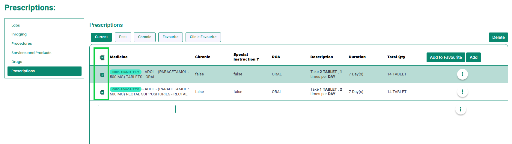 - Select one or more prescriptions using the checkboxes, or click Select All checkbox, as shown in the image below.
