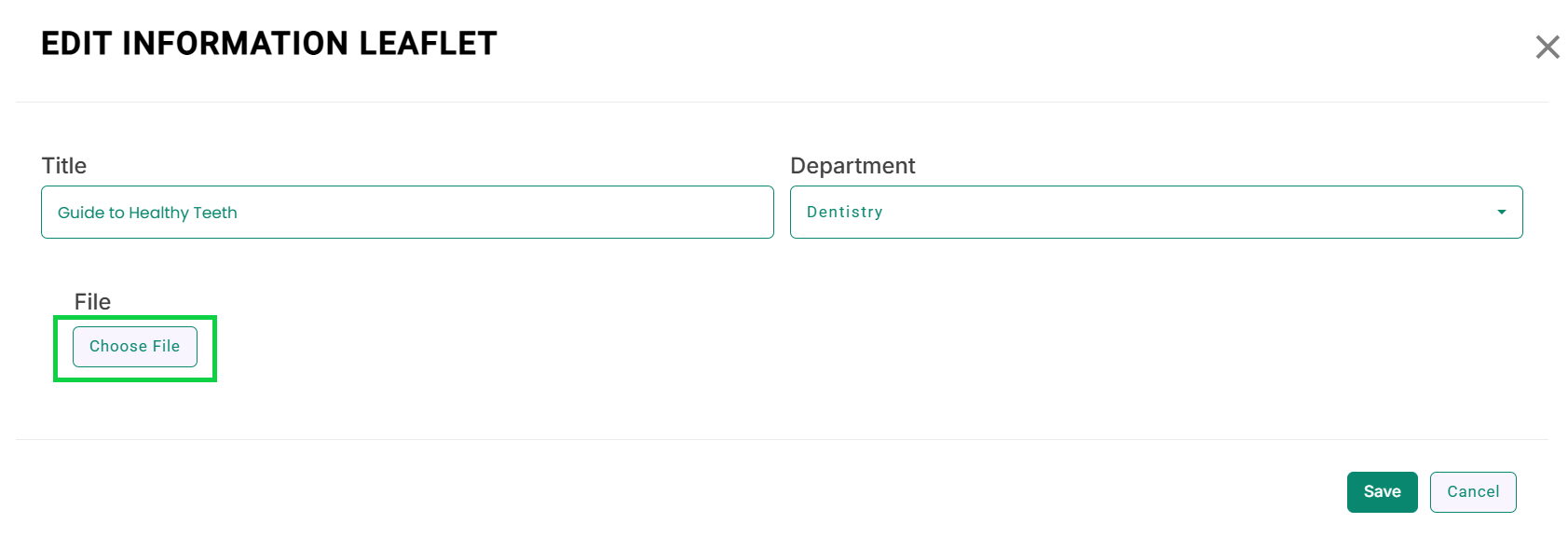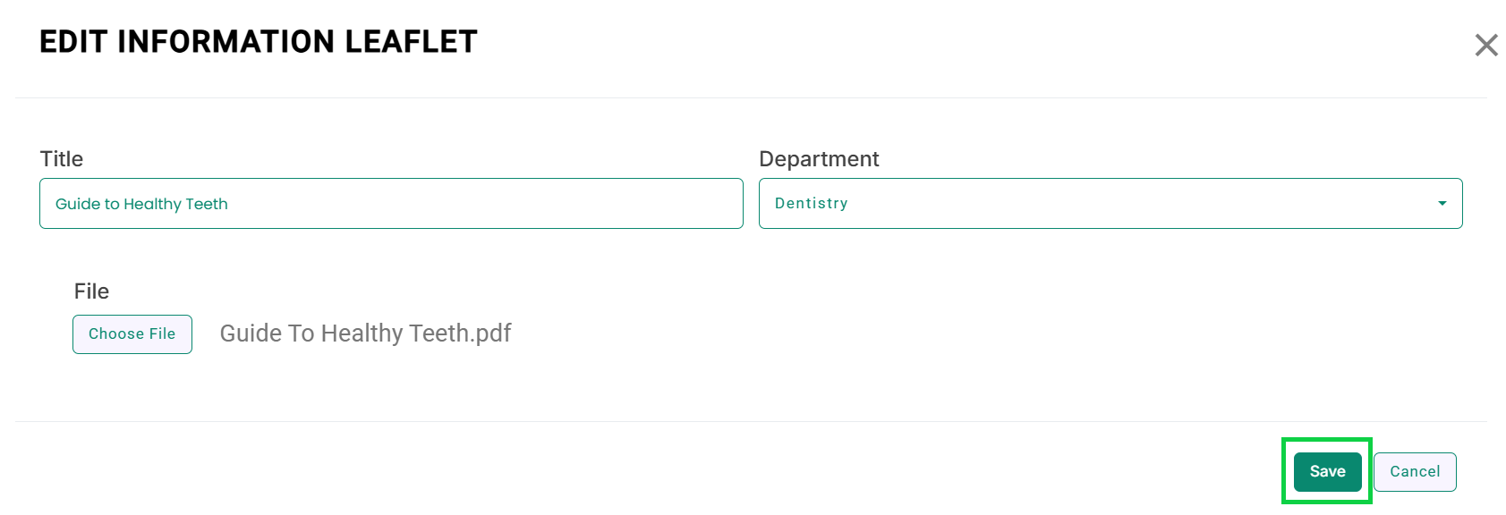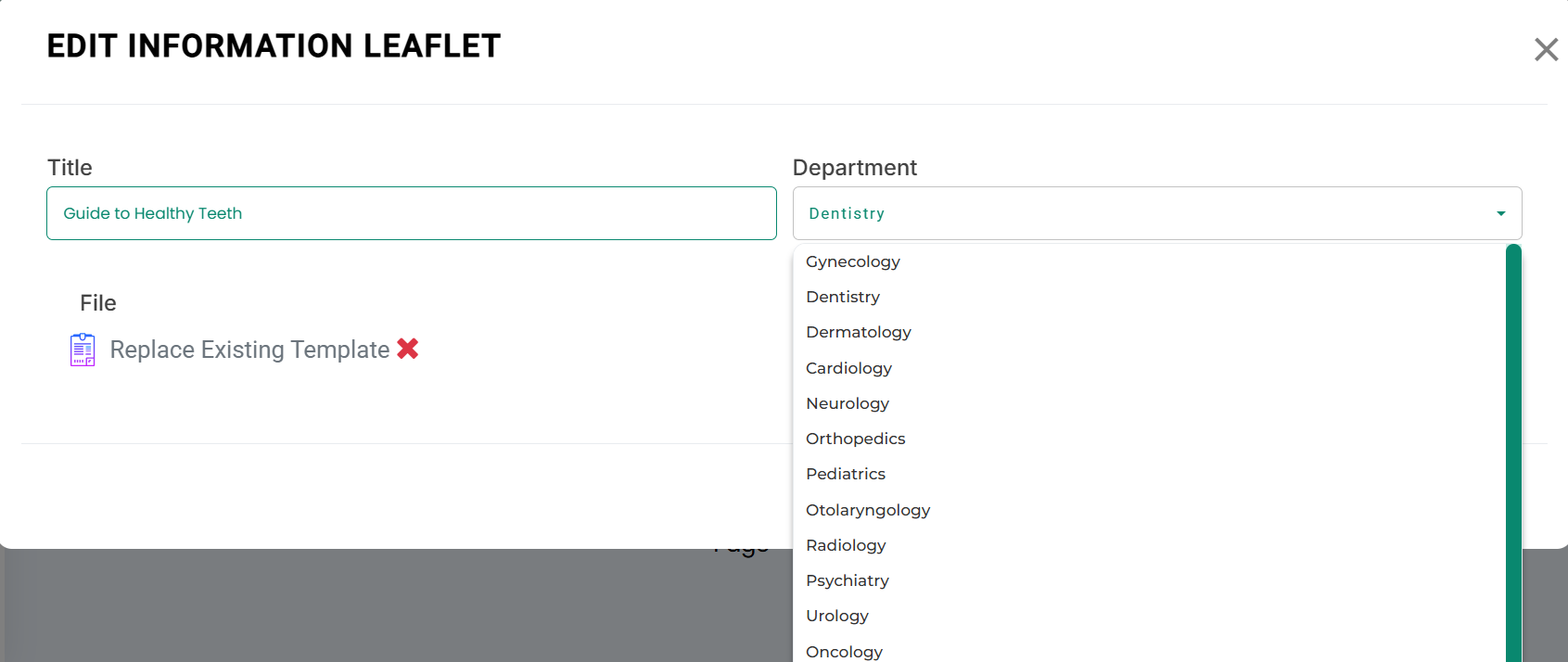 - The Edit Information Leaflets Template modal will open, as shown in the image.
