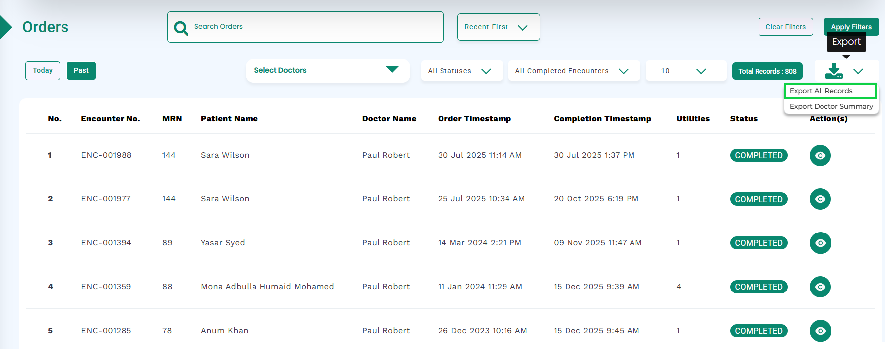 The report will display the Encounter Number, Patient MRN, Patient Name, Doctor Name, Order Date & Time, Completion Timestamp, Number of Utilities, and Status, as shown in the image below.