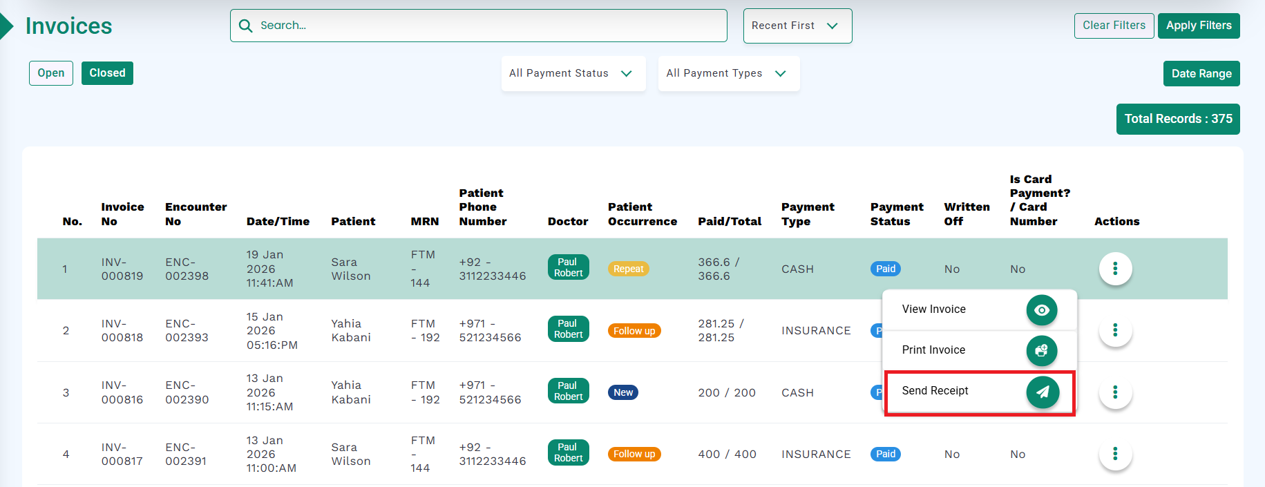 Receipts with a status of Partially Paid or Paid can be sent to the patient.