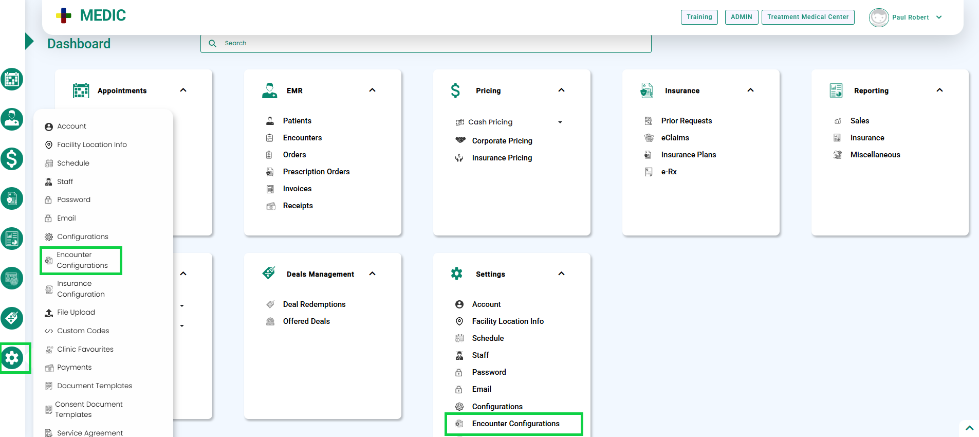 - Go to the Settings module and select Encounter Configuration either directly from the dashboard or from the left navigation bar, as shown below.